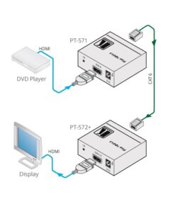 El PT−571 convierte una señal HDMI a una señal de par trenzado ( Cat6 ) y el PT−572+ reconvierte la señal de par trenzado a una señal HDMI.